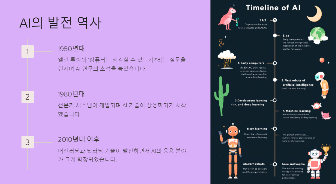 AI의 역사는 1950년대에 시작되었습니다. 앨런 튜링이 '컴퓨터는 생각할 수 있는가?'라는 질문을 던지면서 AI 연구의 초석을 놓았습니다.
