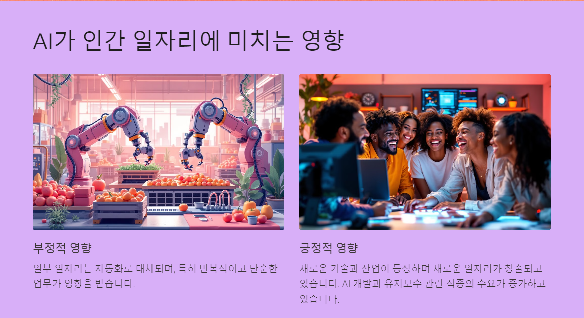 AI가 일자리에 미치는 영향은 긍정적 측면과 부정적 측면이 공존합니다.