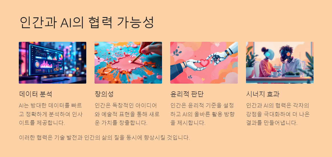 AI는 인간의 업무를 보완하며 생산성과 창의력을 증진시킬 수 있습니다.