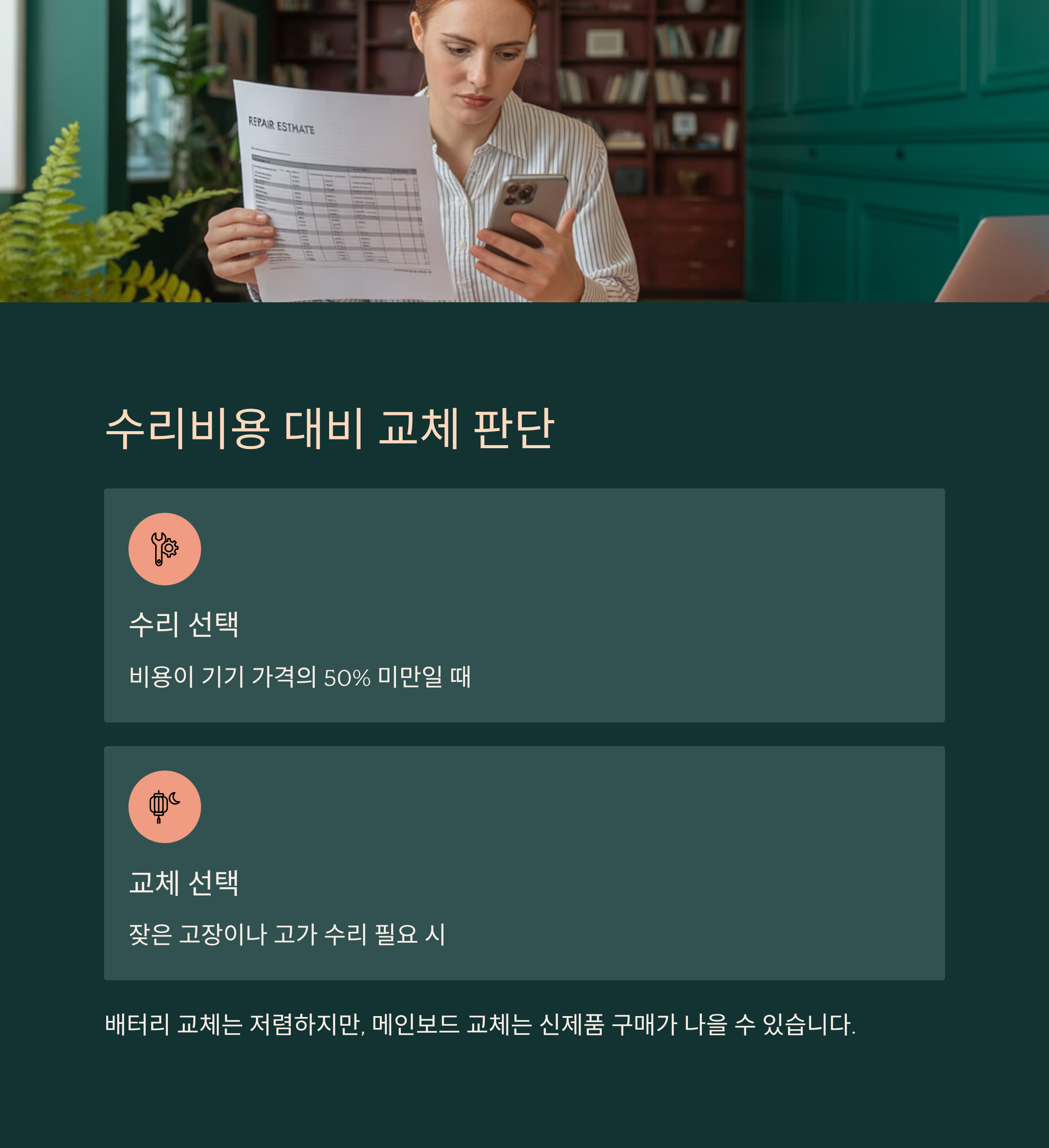 | 액정 파손 | 비용이 합리적일 경우 | 최신 기기 가격과 비슷하다면 교체 |