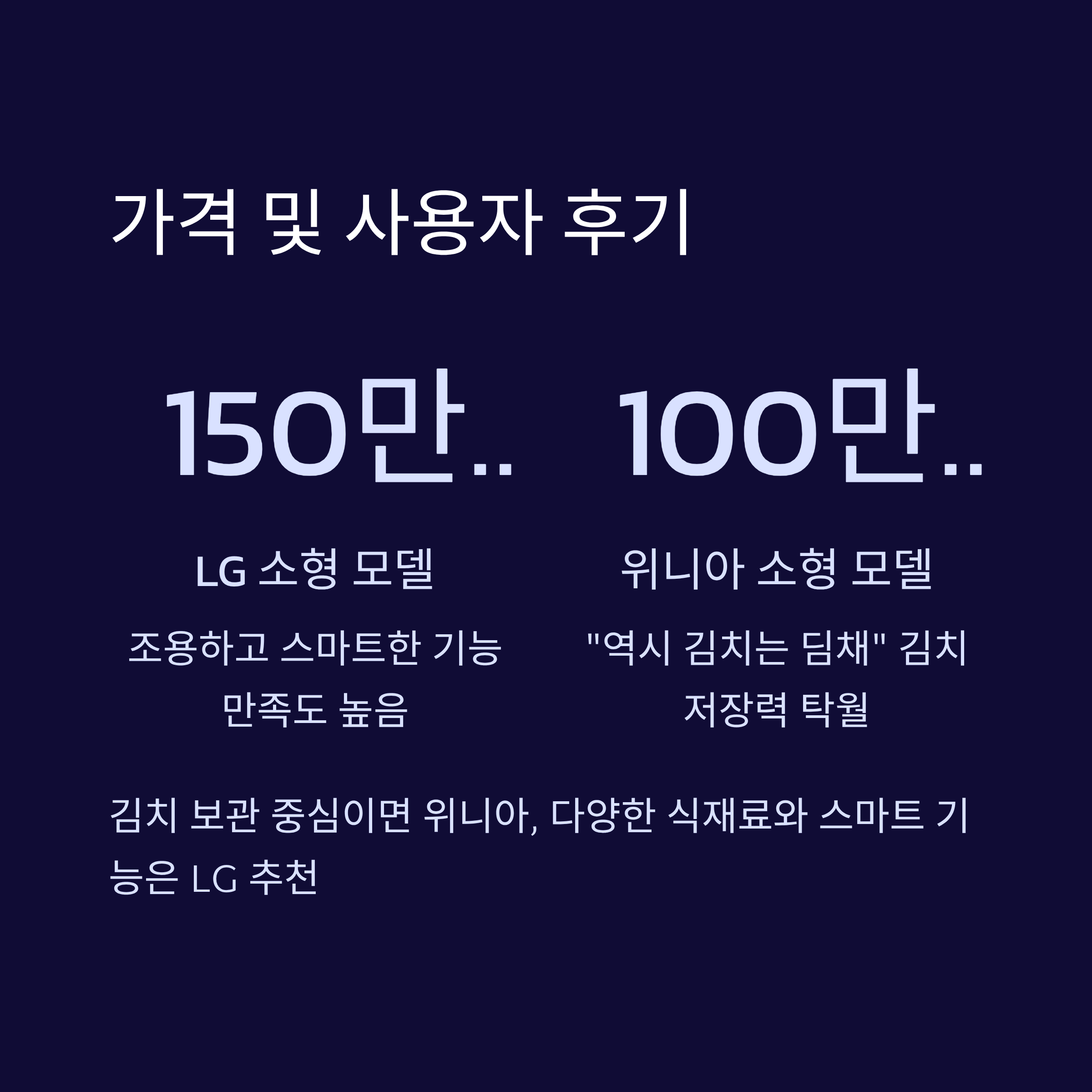 LG는 기술력, 스마트 기능, 저소음 등 프리미엄 요소를 고려하면 가격이 납득 가능하다는 평가가 많고, 위니아는 김치맛에 집중한 효율성으로 가격 대비 만족도가 높아요. 각자의 지향점이 달라서 어떤 소비자에게 더 나은지는 명확해요.