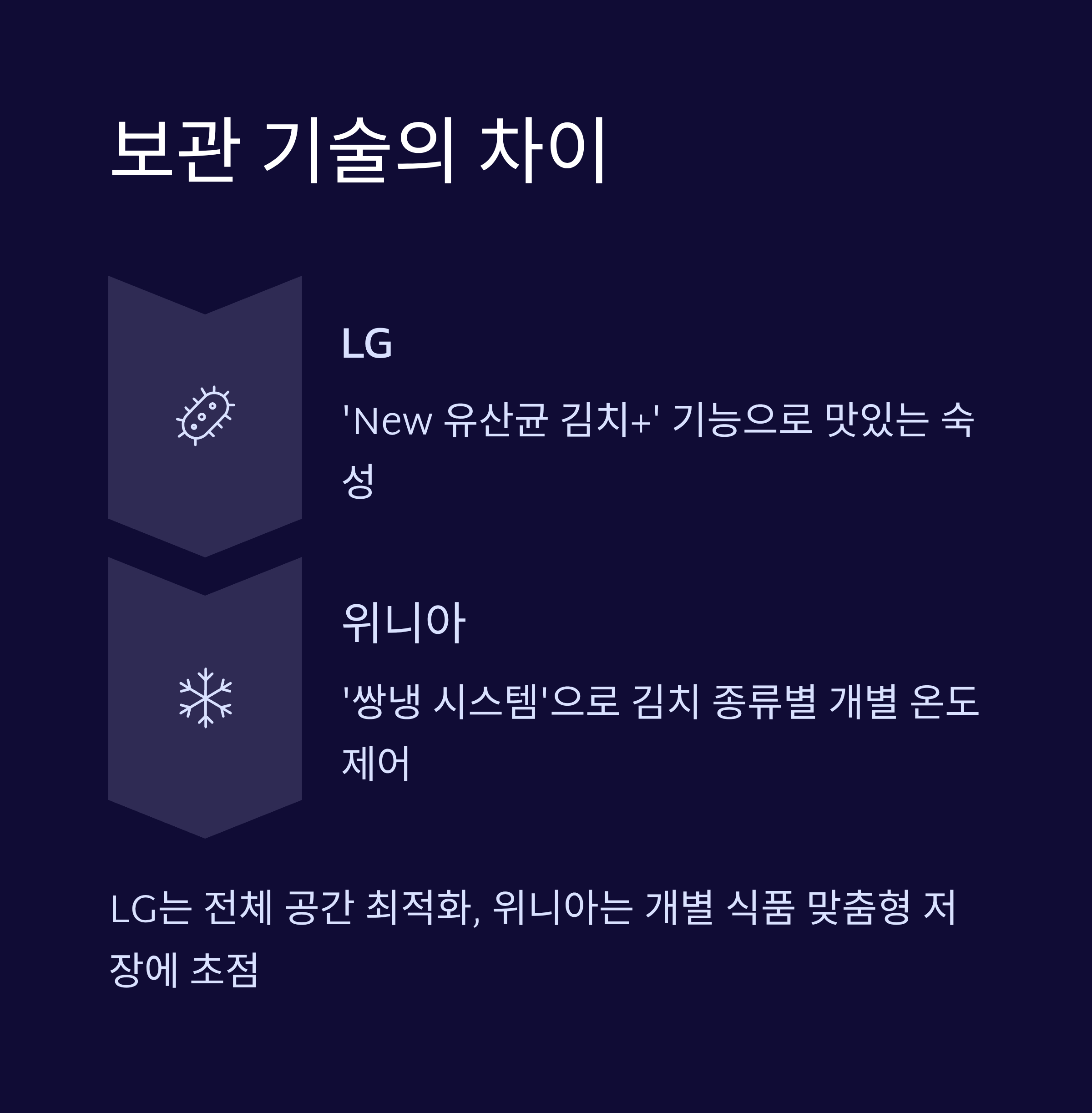 이 두 기술은 서로 다른 철학을 가지고 있어요. LG는 ‘전체 공간 최적화’에 집중하고 있고, 위니아는 ‘개별 식품 맞춤형 저장’에 초점을 맞추고 있는 점이 확연해요. 🤓