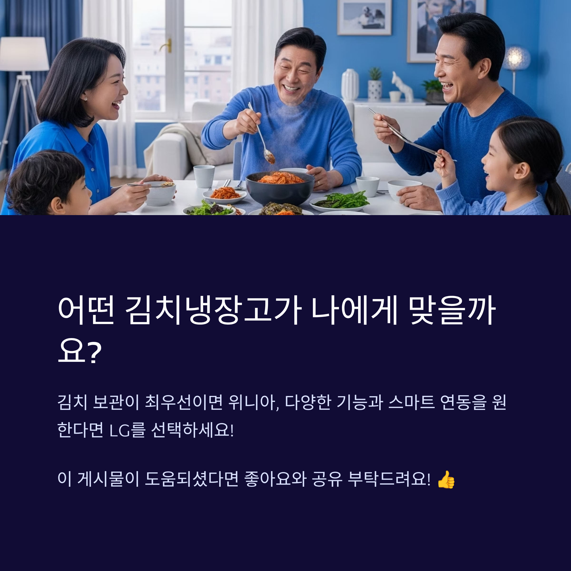 예를 들어, 다양한 식재료를 함께 보관하려는 분이라면 LG가, 오로지 김치 보관에 최적화된 제품을 원한다면 위니아 딤채가 더 적합할 수 있답니다. 😋