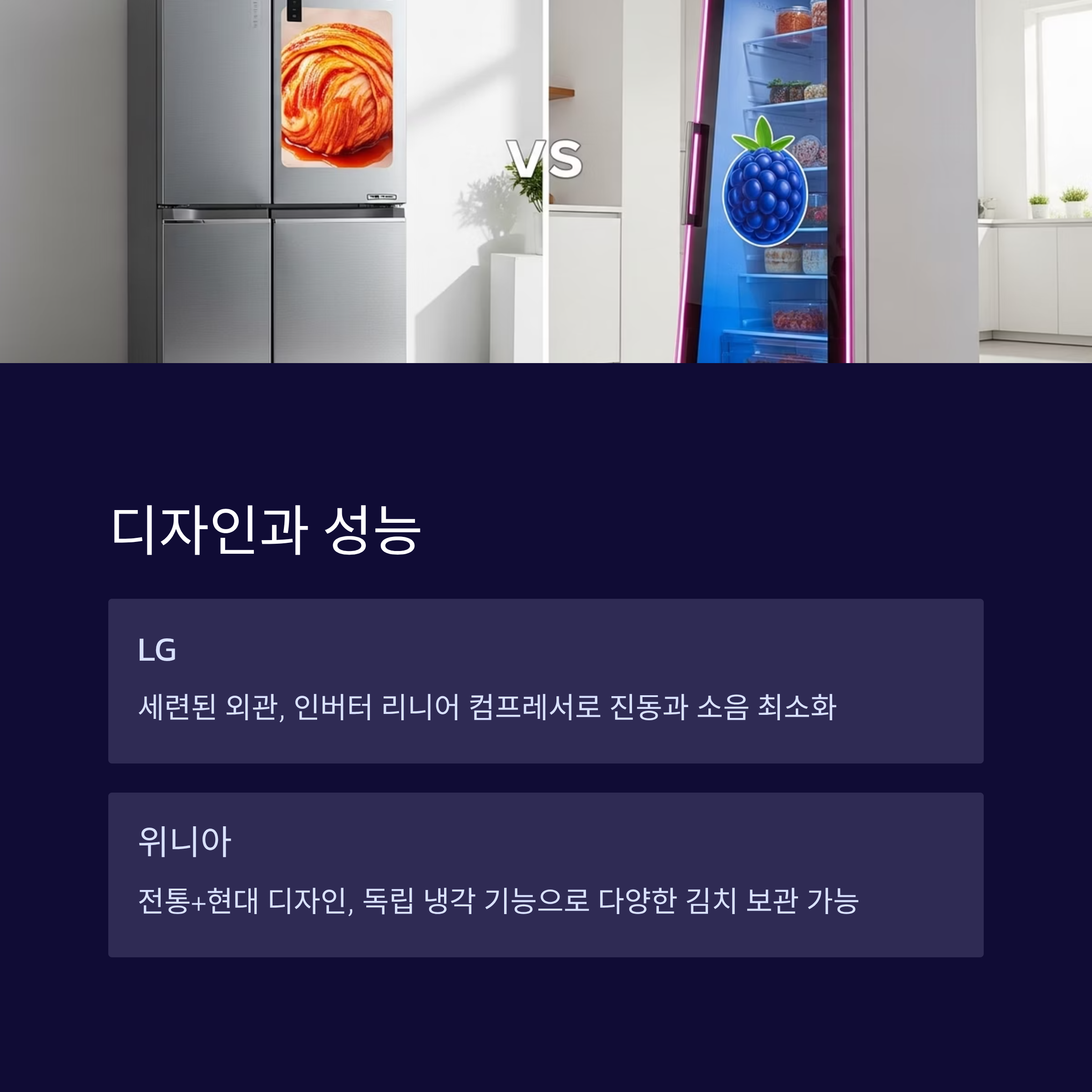A8. 김치 보관이 핵심이면 위니아, 다양한 식재료와 스마트 기능 원하면 LG를 추천해요.